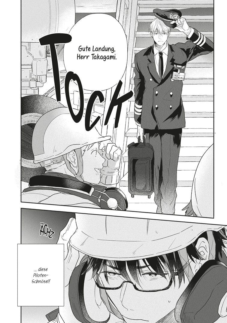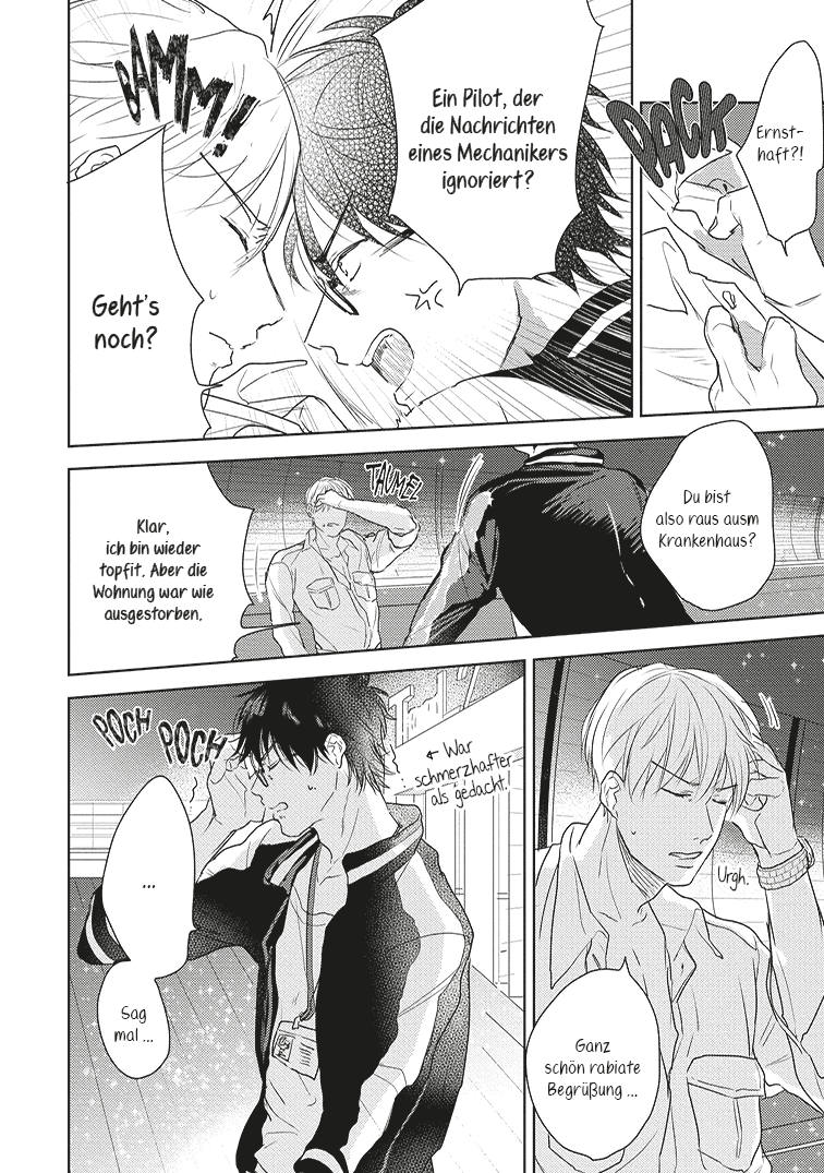 Munaita-sensei: Piloten, die durch den Himmel fliegen, haben einfach Glamour und sind wahnsinnig cool, oder? (lacht) Ich liebe japanische Luftfahrt-Dramen wie Good Luck!!* oder den Film Happy Flight, die haben mich stark geprägt. Mich interessieren besonders Geschichten, die zwar auch Liebesbeziehungen und persönliche Dramen zeigen, aber vor allem den Arbeitsalltag in den Mittelpunkt stellen – mit Menschen aus ganz unterschiedlichen Berufsgruppen wie Pilot:innen, Mechaniker:innen, Flugbegleiter:innen und dem Bodenpersonal, die gemeinsam und mit Stolz ihren Job machen. Natürlich ist die Darstellung von Liebesbeziehungen ein zentraler Reiz von Boys-Love-Geschichten, aber ich finde, es darf ruhig auch Werke geben, die den Arbeitsalltag in den Vordergrund stellen. Das war für mich der Ausgangspunkt.