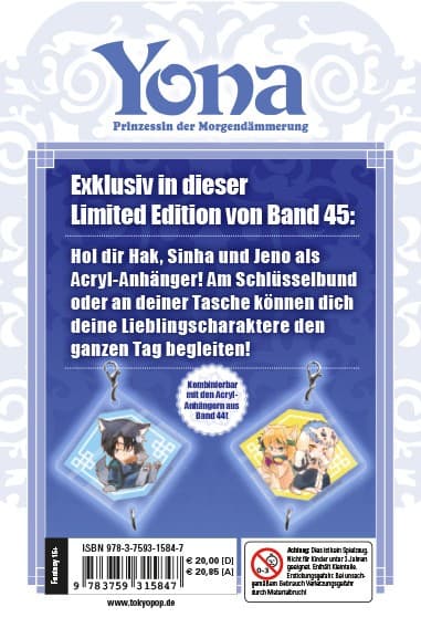 Der Verlagswebseite zufolge wartet die offiziell seit dem 08. Oktober erhältliche Limited Edition zu Yona – Prinzessin der Morgendämmerung Band 45 mit zwei Acryl-Schlüsselanhängern von Hak beziehungsweise Sinha und Jeno auf. Zu Band 44 gab es zuletzt ebenfalls zwei Anhänger – mit Yona, Yun, Gija und Jeaha als Motiv. Während die reguläre Fassung 7,50 € kostet, wird die limitierte Sonderausgabe zum Preis von 20,00 € angeboten.
