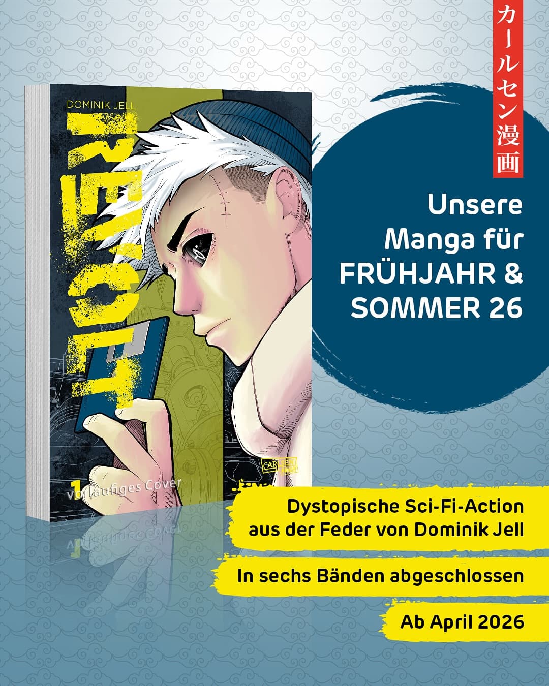 Via Social Media wurde bekannt gegeben, dass Carlsen Manga! ab April 2026 Dominik Jells neuste Reihe namens REVOLT verlegen wird. Das besagte Werk, das ab 15 Jahren empfohlen und als „düstere Dystopie voller Cyberpunk-Ästhetik und gesellschaftskritischer Tiefe, die zum Nachdenken über Verantwortung und Zukunft anregt“ beschrieben wird, umfasse insgesamt sechs Bände. Weitere Details zu dem Release stehen aktuell noch aus – an dieser Stelle findet sich ein Sneak Peak auf die Zeichnungen. Zuvor hat der Autor und Zeichner schon die beiden eingangs erwähnten Arbeiten unter dem Hamburger Herausgeber publiziert.