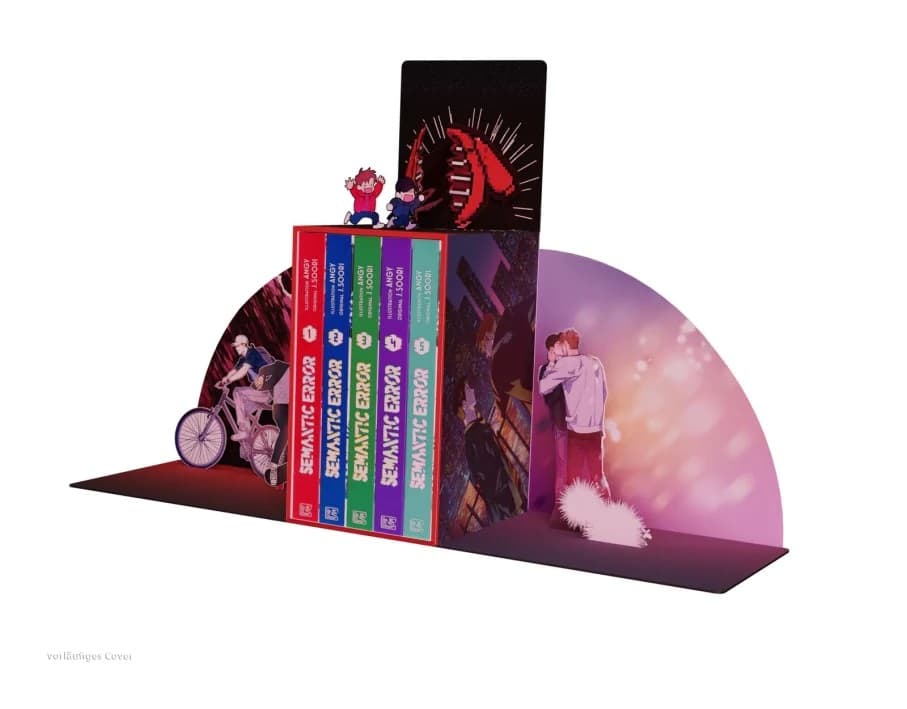 C LINES wird zusammen mit dem fünften und damit zugleich finalen Band eine Box zum Semantic Error-Manhwa produzieren. Neben dem Leerschuber-Bundle mit Band 05 für 40,00 € wird eine komplett befüllte Variante zum Preis von 104,00 € angeboten. Beide Fassungen warten zusätzlich mit Extras auf. Offiziell soll der Release zum 28. Juli 2026 erfolgen. Bislang sind drei Bände für je 16,00 € auf Deutsch erhältlich – samt Photocards in den entsprechenden Erstauflagen. Interessierte können sich an dieser Stelle einen ersten Eindruck von der Handlung und dem Zeichenstil verschaffen.